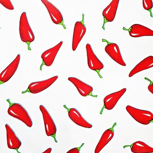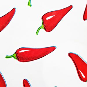 Voksduk fra Mexico med røde chilier på hvit bakgrunn.